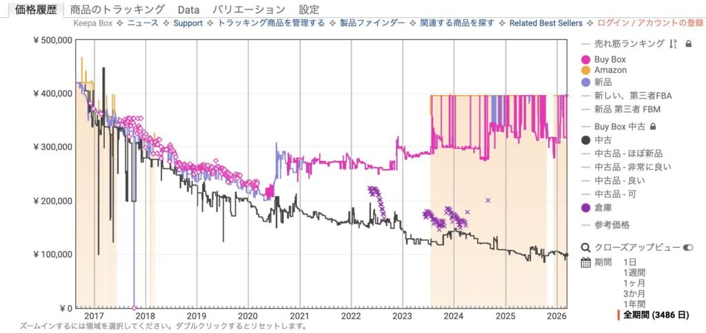 Amazonの全期間価格推移データ(Keepa)が、この機体の異常な市場動向と、今回の「生産完了」がもたらす影響を完全に証明しています。
